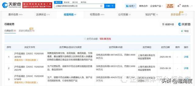 天眼风险信息显示,该公司曾多次因销售不合格食品被罚,今年9月,该公司因销售危害人体健康的物质含量超过食品安全标准限量的食用农产品被罚;2024年11月,该公司因生产、销售不符合保障人体健康和人身、财产安全的国家标准、行业标准的产品被罚。