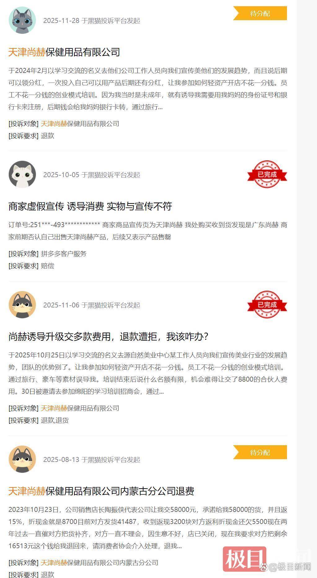 新浪黑猫平台有不少投诉 与此同时,在新浪黑猫平台上查询,极目新闻记者发现,不少网友反映天津尚赫保健品有限公司诱导消费者加盟,实则是买该公司的保健品和仪器,让消费者以检查为由将产品全部拆开,随后拒绝退货退款。