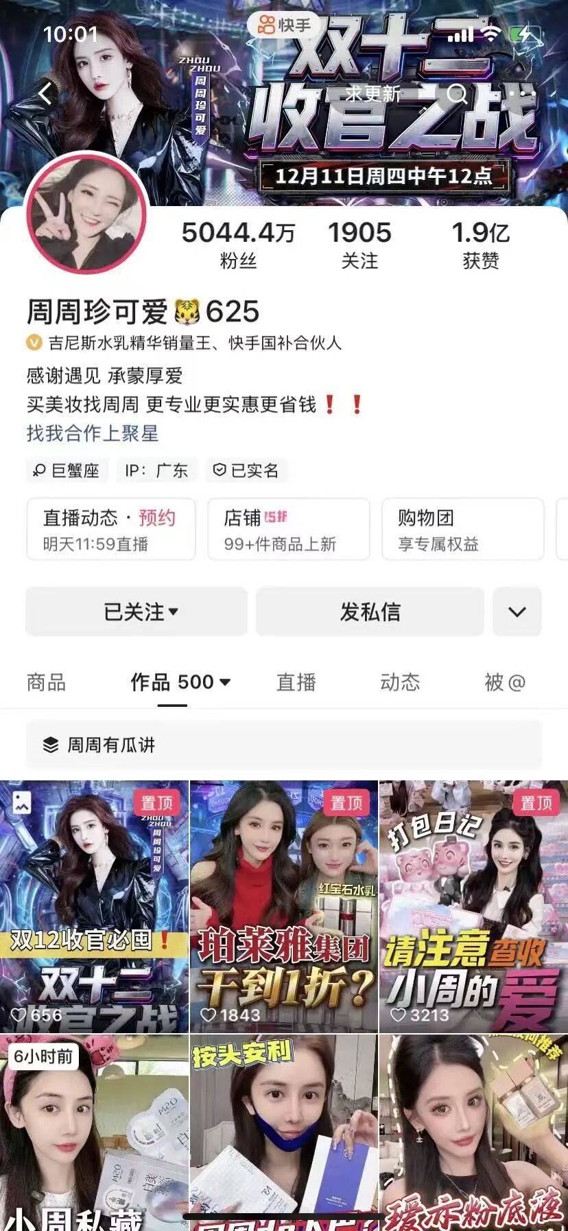 “周周珍可爱625”实名信息“周珍”,截至发稿前,在该平台拥有5044.4万粉丝,账号认证为吉尼斯水乳精华销量王,视频内容以美妆产品为主。近期销量超过99%同行,近7天热卖商品超10万件。