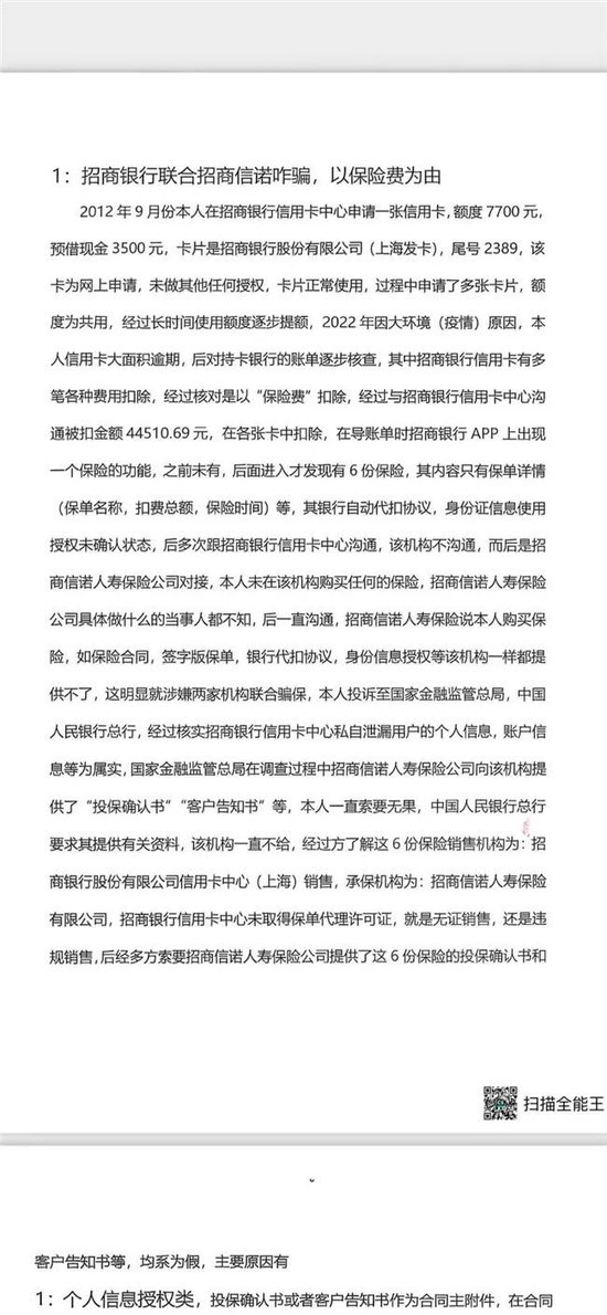 消费日报讯(记者 卢岳)近日,本报记者收到一份举报信称,举报招商银行与招商信诺人寿保险有限公司(简称:招商信诺)涉嫌联合骗保,在个人信用卡账单中设下“保险陷阱”。“2022年因逾期核查账单时,发现有6笔“保险费”在他不知情、未授权的情况下被扣除,累计金额达44510.69元。”