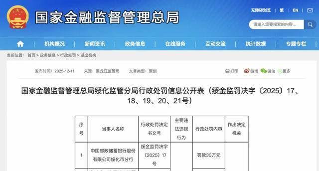 根据绥化监管分局行政处罚信息公开表,中国邮政储蓄银行股份有限公司绥化市分行因贷款“三查”不到位被罚款30万元。同时,该分行普惠金融事业部负责人张宗亮、客户经理石磊,以及时任北林支行行长杨晓微、客户经理李佳朋等四人分别被给予警告处罚。