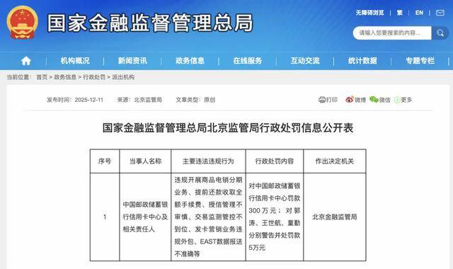 具体来看,国家金融监督管理总局北京监管局今日公布行政处罚信息表显示,邮储银行(5.440, -0.04, -0.73%)信用卡中心违规开展商品电销分期业务、提前还款收取全额手续费、授信管理不审慎、交易监测管控不到位、发卡营销业务违规外包、EAST数据报送不准确等问题,被处以罚款300万元。除对机构罚款外,该中心相关责任人郭涛、王世航、童勤三人分别被给予警告,并各处罚款5万元。
