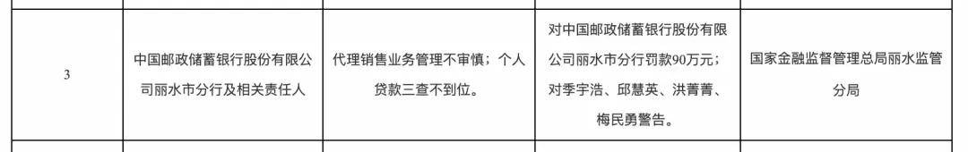 根据国家金融监督管理总局丽水监管分局今日的罚单信息显示,中国邮政储蓄银行股份有限公司丽水市分行及相关责任人因代理销售业务管理不审慎、个人贷款“三查”不到位,被国家金融监督管理总局丽水监管分局罚款90万元。该分行责任人季宇浩、邱慧英、洪菁菁、梅民勇四人被处以警告。
