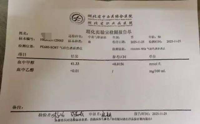 家属提供的检测报告显示,11月25日,李某某血中甲醇含量为41.33mmol/L,正常参考区间小于0.0156mmol/L。