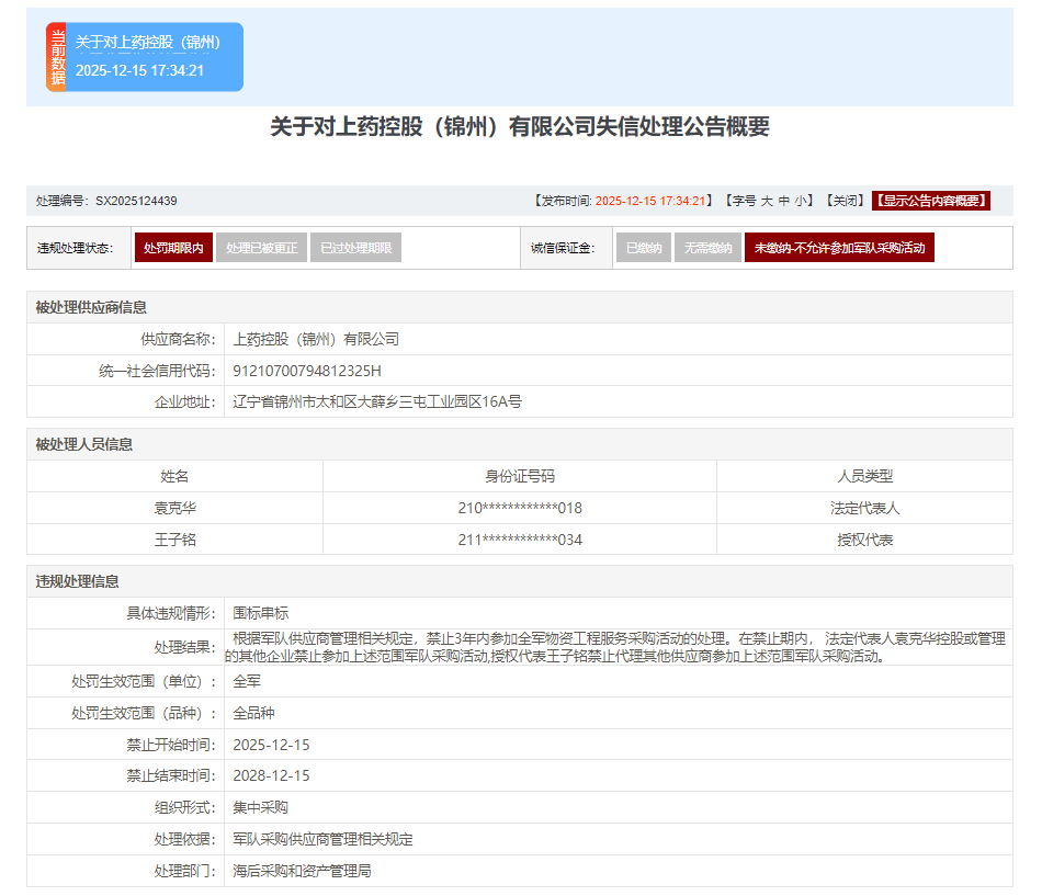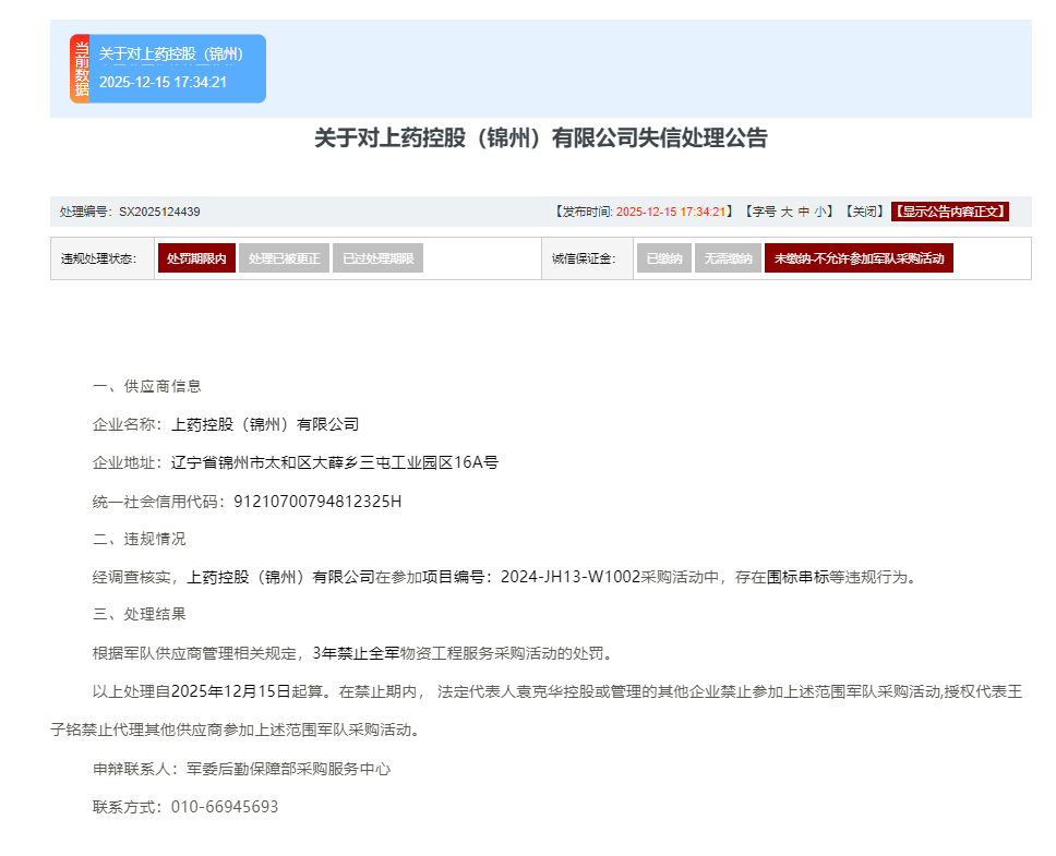 探针财经从军队采购网获悉,2025年12月15日,该网发布一则失信处理公告(编号:SX2025124439),对上药控股(锦州)有限公司在采购活动中的违规行为作出处理。