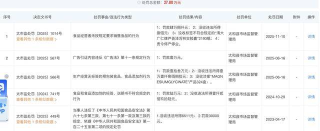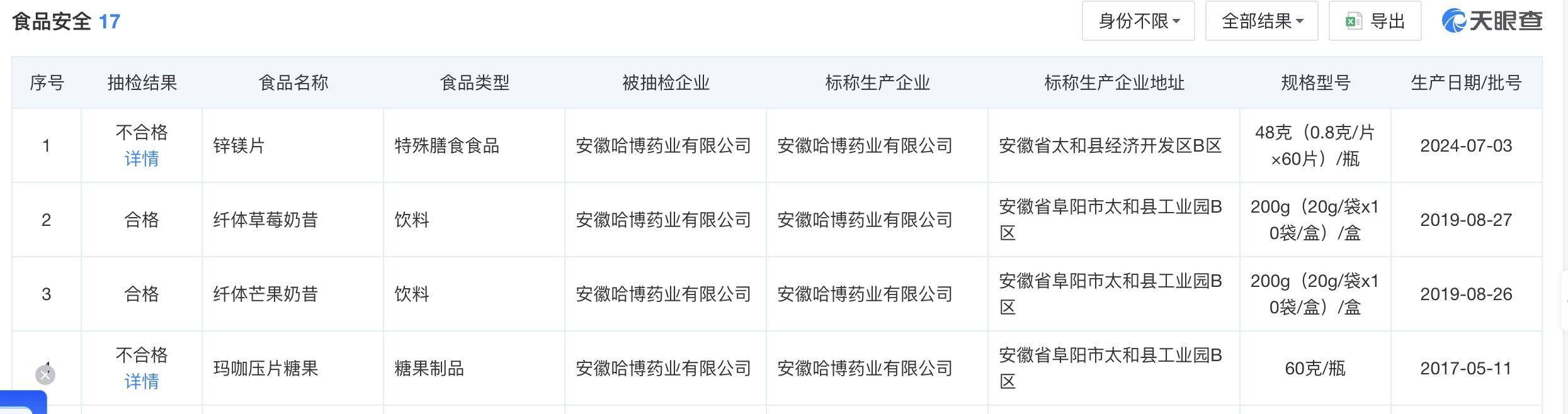 哈博药业是一家主营保健食品贴牌代加工(OEM/ODM)的服务商。天眼查显示,其存在多次行政处罚记录和食品安全问题。例如,2025年6月曾因广告引证内容违反《广告法》第十一条规定行为被罚款一万元,其累计被罚金额27.8万元。2024年7月,其生产的锌镁片抽检不合格。