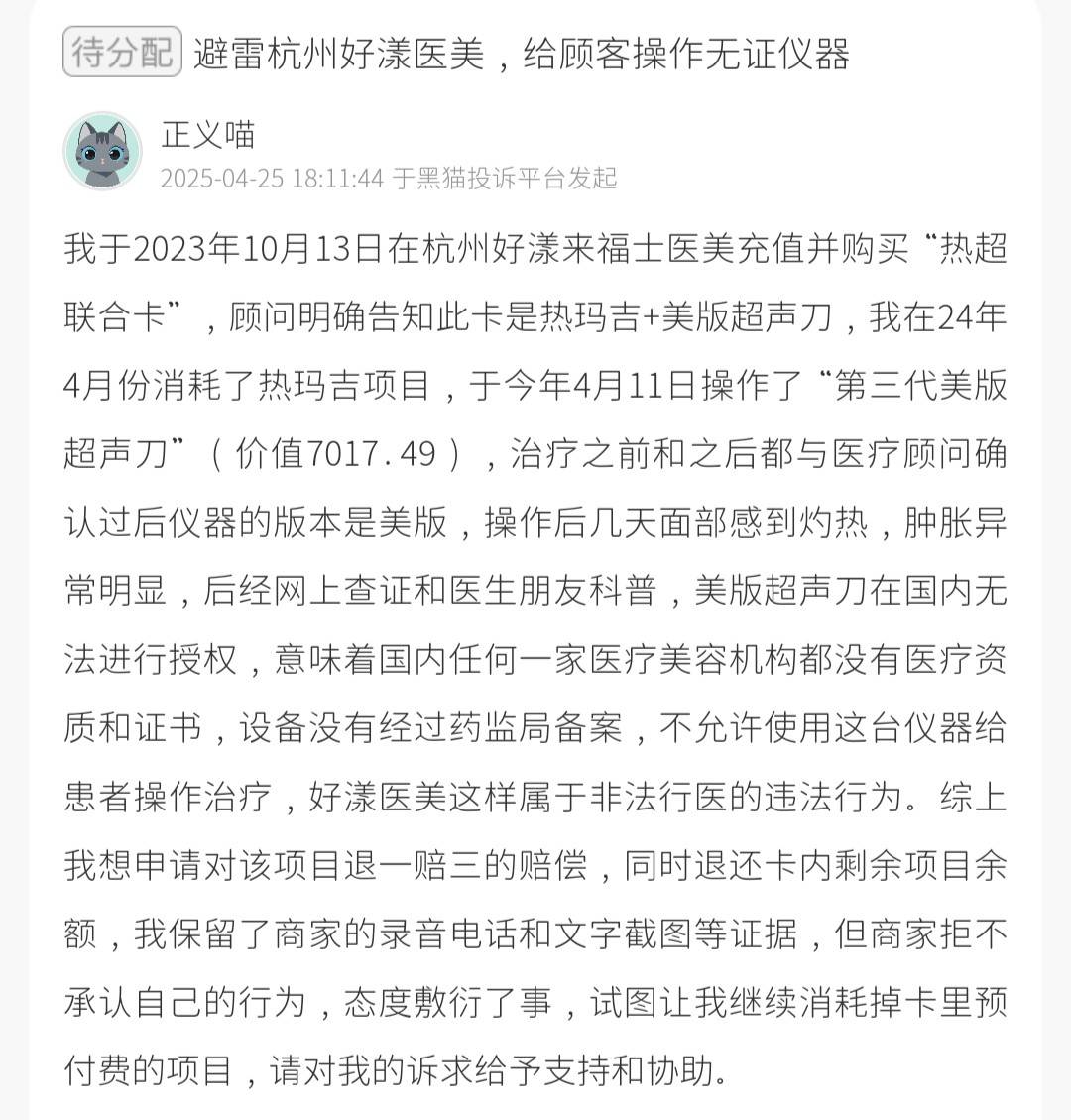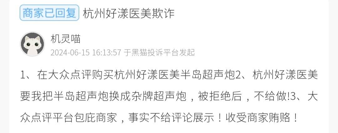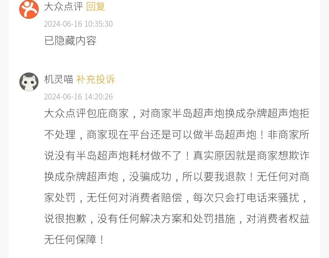 杭州好漾医疗美容诊所除被消费者质疑擅自替换注射类医疗器械外,还因“更换超声炮设备”遭到消费者公开投诉。2024年6月15日,黑猫投诉平台用户发文称,其通过大众点评下单杭州好漾医疗美容诊所明确标注为“半岛超声炮”的项目,到院后工作人员却直接提出“把半岛超声炮换成杂牌超声炮”,并以“耗材已用完、设备故障”等理由要求该消费者接受替换,在该消费者当场拒绝、坚持按订单使用正品半岛设备后,院方随即取消服务并强制退款。