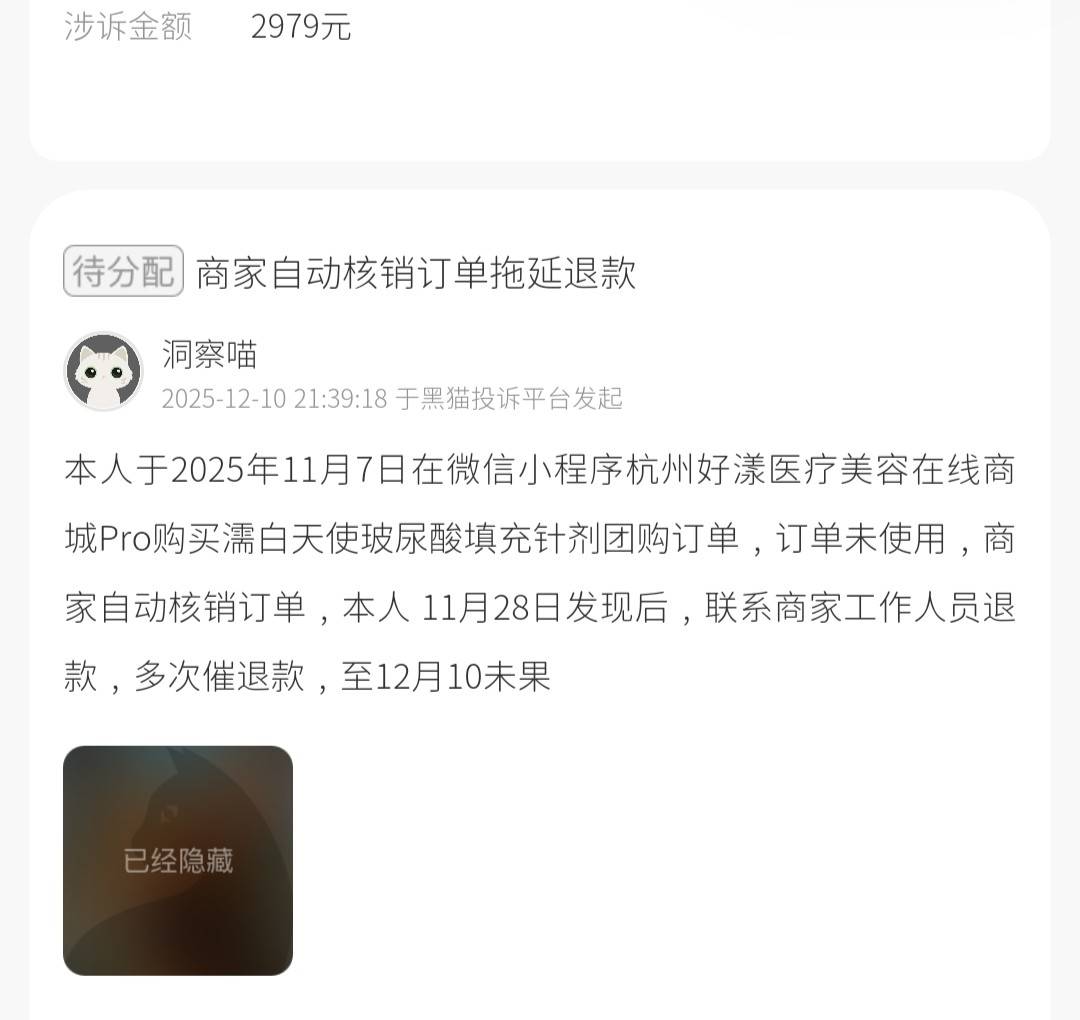 12月10日,有消费者投诉称,其于11月7日在微信小程序“杭州好漾医疗美容在线商城Pro”支付2979元购买“嗨白大使玻尿酸填充针剂”团购订单,在尚未预约使用的情况下,商家系统却自动核销了订单。自11月28日发现后,该消费者多次联系商家要求退款,截至12月10日仍无结果。