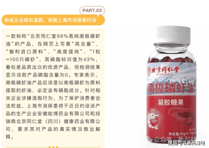 近日,上海市消保委发布的检测结果将同仁堂推入舆论焦点。一款名为“北京同仁堂99%高纯南极磷虾油”的产品,其标注的43%磷脂含量经检测实际为零,产品成分标识存在造假问题。