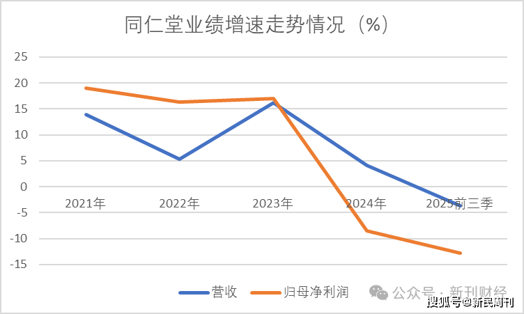 同仁堂最新的财务表现,同样传递出另一层面的压力信号。2025年三季报显示,公司经营业绩延续了自2024年以来的下滑态势。前三季度实现营业收入133.08亿元,同比下降3.70%;归母净利润为11.78亿元,同比下降12.78%。值得注意的是,公司在2024年已出现“增收不增利”的情况,营收微增但归母净利润同比下滑8.54%,为近五年来首次出现净利润负增长。