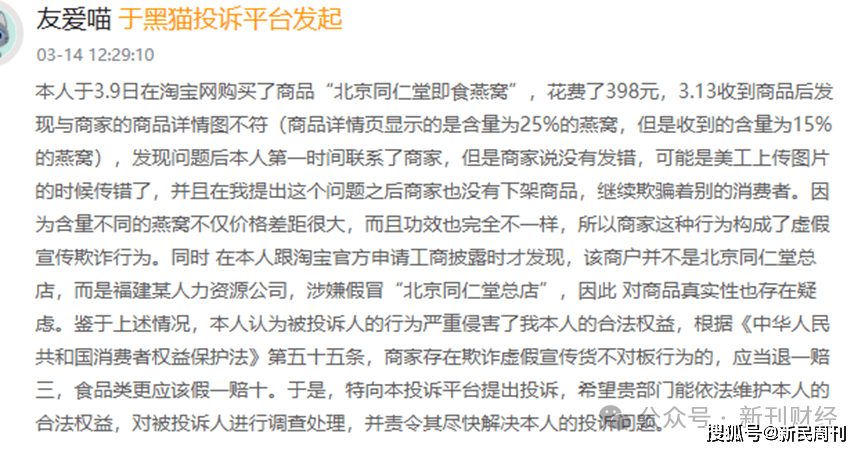 笔者发现,黑猫投诉平台上的数据同样令人担忧,截至12月15日,关于同仁堂产品的投诉量达254条,内容包括产品质量不符、成分标注不实等。其中有消费者投诉称,购买的祛痘产品实际含量与宣传不符;另有消费者发现,标注含有25%燕窝的产品实际含量仅为15%,而商家竟以“美工上传图片问题”为由搪塞。