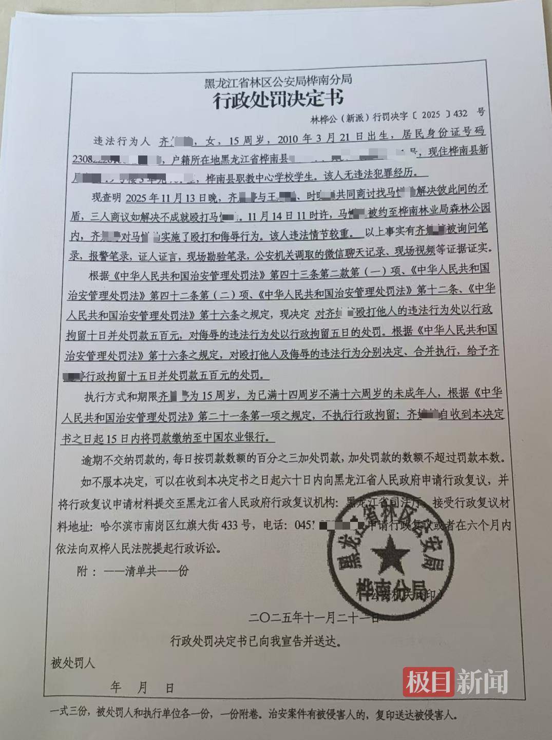 马女士称,视频中的长发女生就是她的妹妹。11月14日12时20分,妹妹回到家中,家人发现她被打立即报警。经过调查,当地派出所对参与霸凌的7名学生给予了行政处罚。据马女士提供的7份行政处罚决定书显示:现查明,2025年11月13日晚,齐某婷与王某悦、时某惠共同商讨找马某仙解决彼此间的矛盾,三人商议如解决不成就殴打马某仙。11月14日11时许,马某仙被约至桦南林业局森林公园内,齐某婷对马某仙实施了殴打和侮辱行为。
