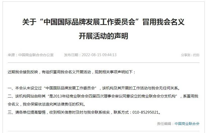 ”中国国际品牌发展工作委员会”是一家什么样的机构呢?2022年8月15日,中国商业联合会发布了“关于‘中国国际品牌发展工作委员会’冒用我会名义开展活动的声明”。声明指出,中国商业联合会从未设立过“中国国际品牌发展工作委员会”,中国国际品牌发展工作委员会网站自称其“是2013年经商业联合会四届四次理事会审议同意设立的商业联合会分支机构”,系冒用中国商业联合会名义。