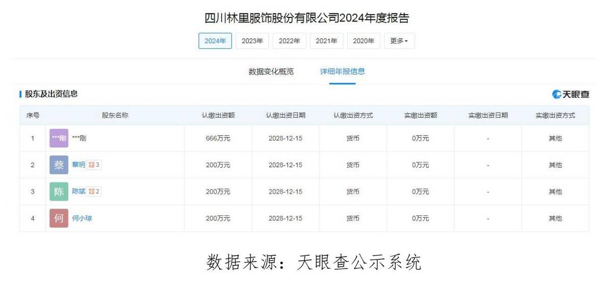 天眼查公示的四川林里服饰股份有限公司2024年度报告显示,四川林里服饰股份有限公司 2017 年 12 月 14日成立,注册资本为1266万元,实缴资本为0元。2023年7月09日,该企业因未依照《企业信息公示暂行条例》第八条规定的期限公示年度报告,被成都市市场监督管理局列入企业经营异常名录 。