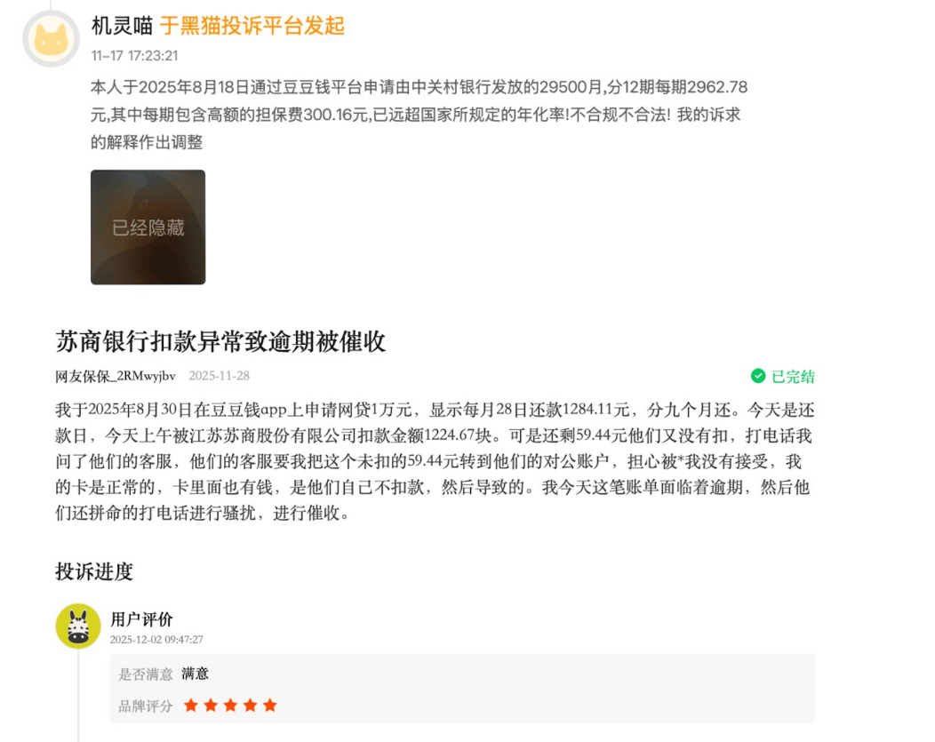 截至12月12日,黑猫投诉上有关“豆豆钱”的投诉量达到27937条,投诉内容多涉及收取高额担保费及服务费、贷款利息超过国家规定范围、平台方拒绝给出此前贷款的合同等问题。