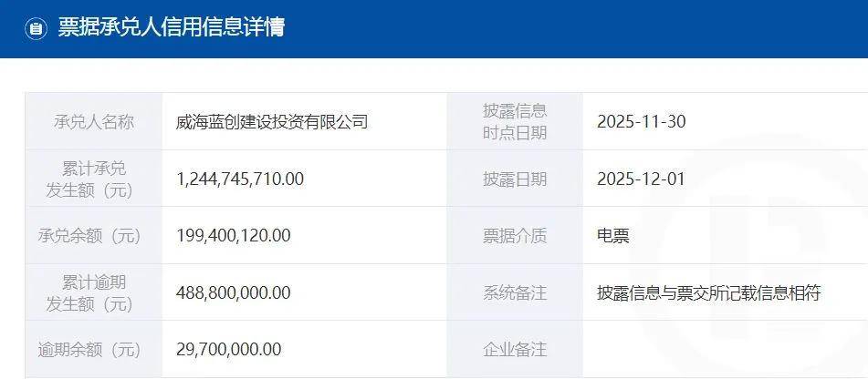 日前,威海蓝创建设投资有限公司(以下简称“威海蓝创”)被列入截至2025年11月30日承兑人逾期名单,上海票据交易所官网显示,公司逾期余额为2970万元。