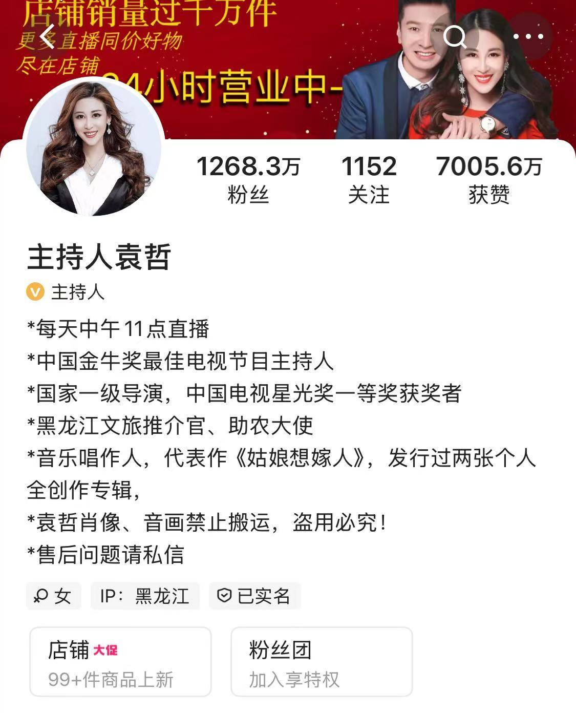 据了解,“主持人袁哲”在该直播平台拥有1268.3万粉丝,账号简介显示,其是黑龙江文旅推介官、助农大使。