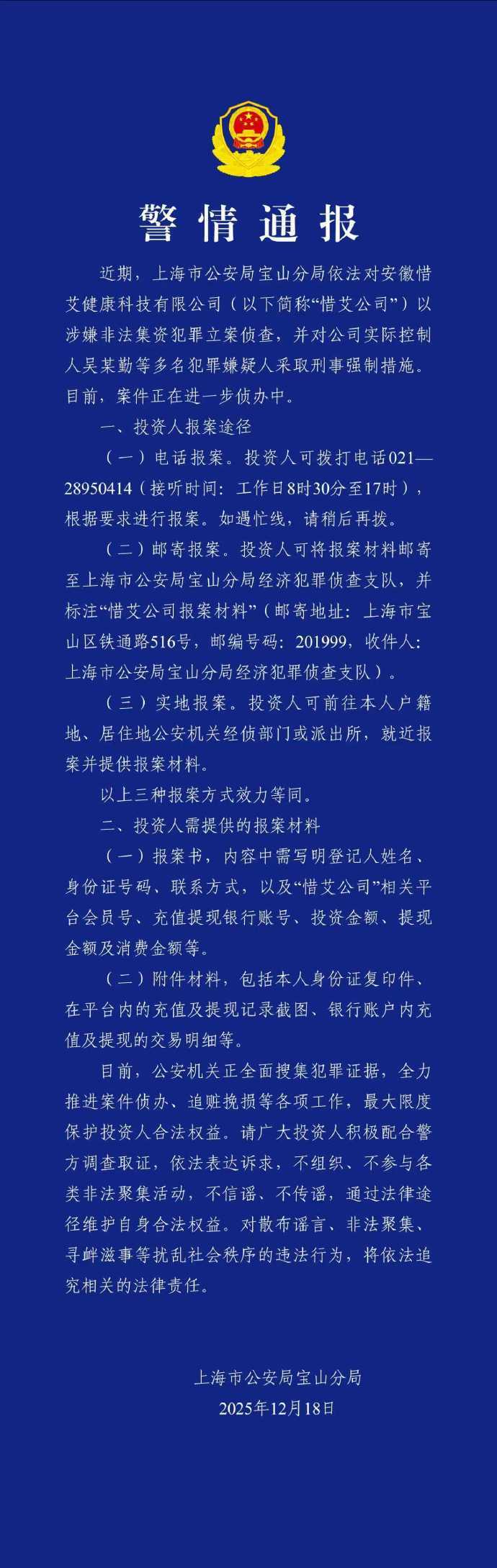 上海市公安局宝安分局12月18日通报,近期,上海市公安局宝山分局依法对安徽惜艾健康科技有限公司以涉嫌非法集资犯罪立案侦查,并对公司实际控制人吴某勤等多名犯罪嫌疑人采取刑事强制措施。目前,案件正在进一步侦办中。