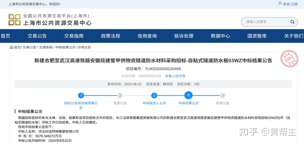 图为:河北科信在调查期间中标新建合肥至武汉高速铁路安徽段