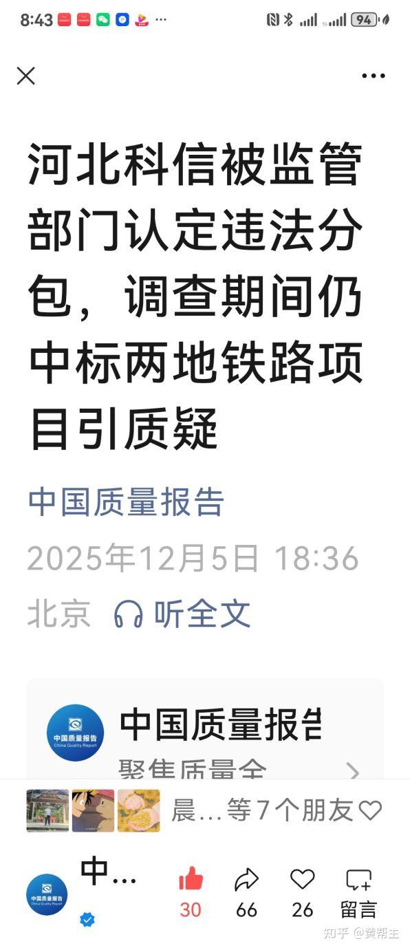 12月5日,中国质量报刊报微信公众号“中国质量报告”发布的记者采访稿件《河北科信被监管认定违法分包,调查期间仍中标两地铁路项目引质疑》