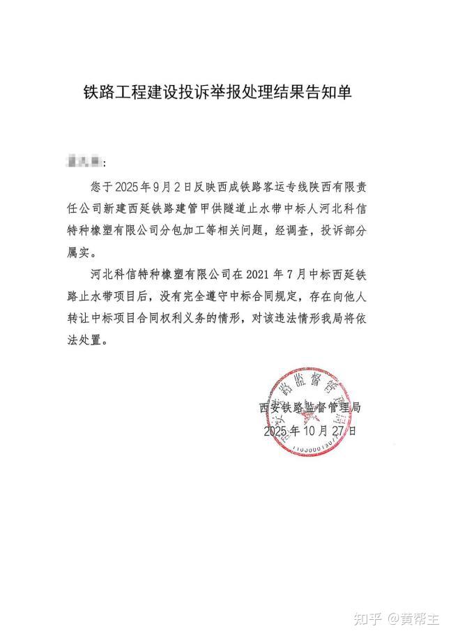 根据西安铁路监管局2025年10月27日出具的《铁路工程建设投诉举报结果告知单》,河北科信于2021年7月中标西延铁路止水带项目后,未完全遵守中标合同规定,存在向他人转让中标项目合同权利义务的违法行为,经调查投诉部分属实,西安铁路监管局明确将依法处置。