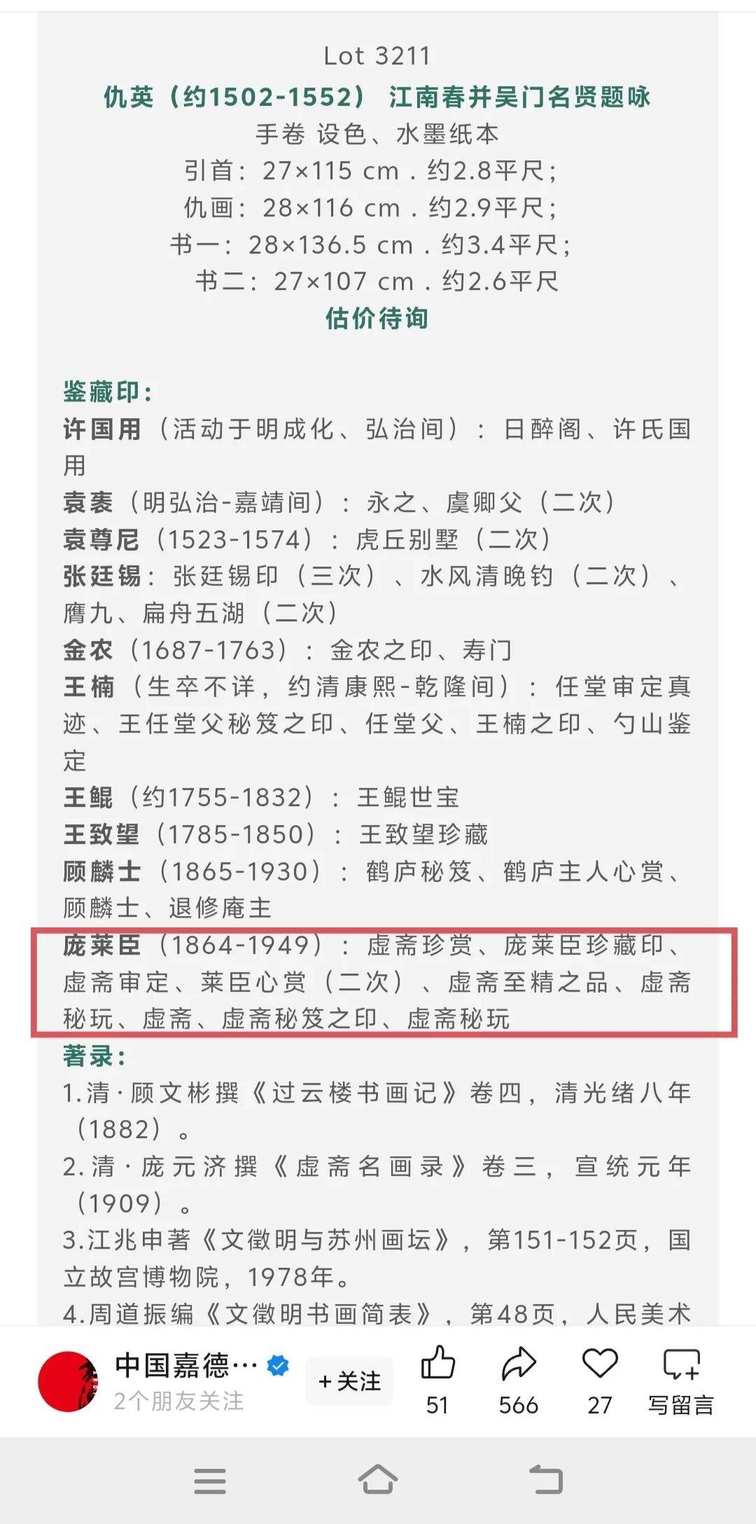 8800万估价的仇英《江南春》图卷,从庞莱臣“虚斋”旧藏,到无偿捐赠给南京博物院,再到疑似现身拍卖市场,澎湃新闻的报道引发公众议论。