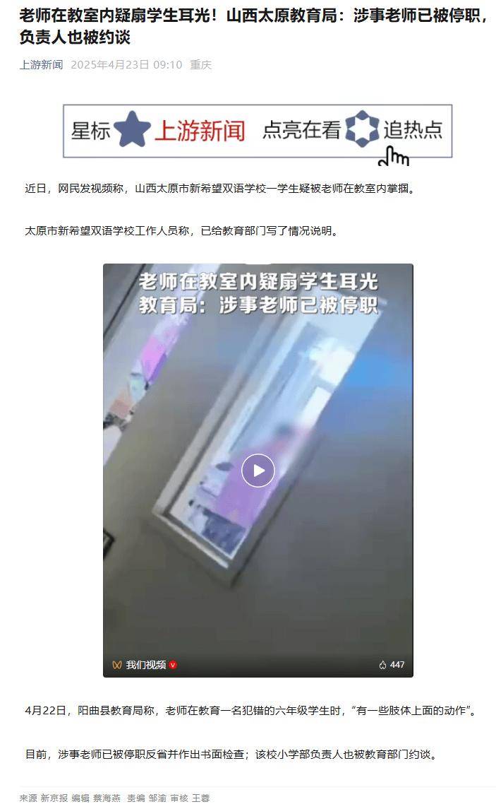 搜索网络后发现,太原新希望双语学校老师竟不止一次,早在2025年4月23日,上游新闻就发布文章《老师在教室内疑扇学生耳光!山西太原教育局:涉事老师已被停职,负责人也被约谈》。