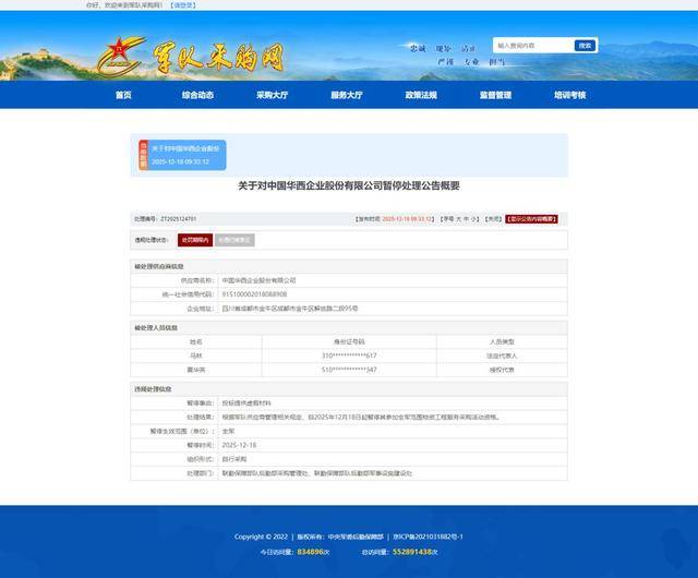 依据规定,处理部门决定对其作出严肃处理:自2025年12月18日起,暂停中国华西企业股份有限公司参加全军范围内物资、工程、服务采购活动的资格。该处理适用于全军所有单位,且明确其“组织形式”为自行采购范畴。