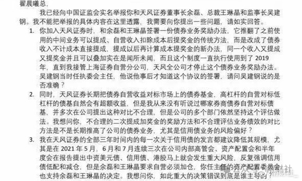 此外,还质疑了翟晨曦的高收入,称其入职天风证券时和董事长、总裁签订了一份债券业绩奖励办法,债券收入不计成本直接提成,提成后再计算成本提取奖金。