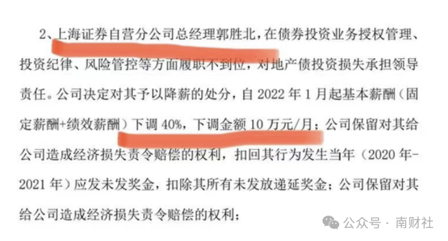 几天后,社交媒体上开始流传一份天风证券的《问责决定书》,其中提到,截至2022年4月末,天风自营分公司债券投资部持有的多只地产债预计亏损约6.75亿。公司因此认定郭胜北“履职不到位”,并将其薪酬下调40%,月薪从25万降至15万元,并扣回2020年至2021年应发未发奖金及递延奖金,并保留追究权利。