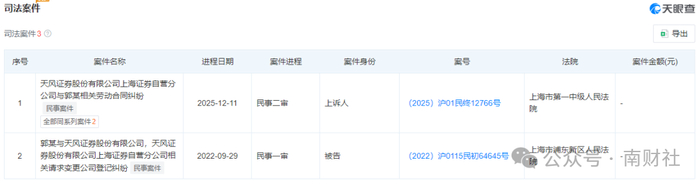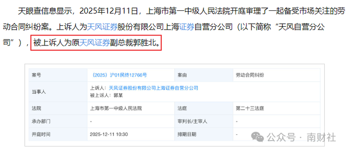 据天眼查显示,12月11日,天风证券股份有限公司上海证券自营分公司起诉郭某相关劳动合同纠纷案件迎来民事二审。