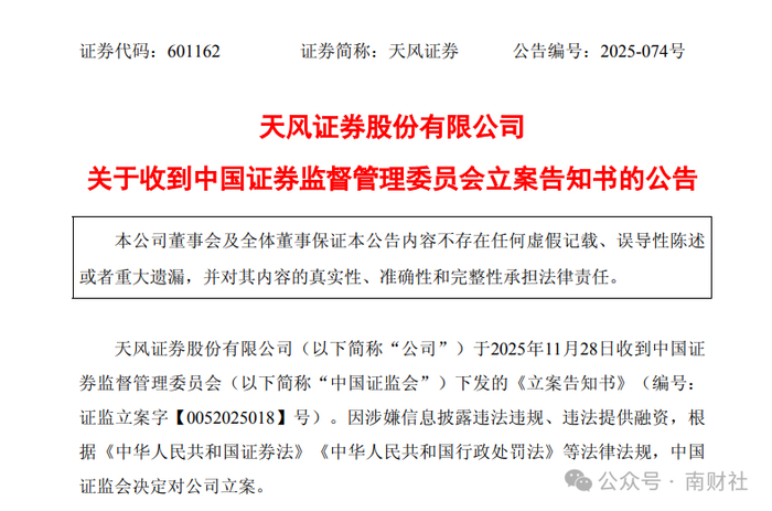 2025年11月28日,天风证券发布公告称,称因涉嫌信息披露违法违规及违法提供融资,被中国证监会立案。