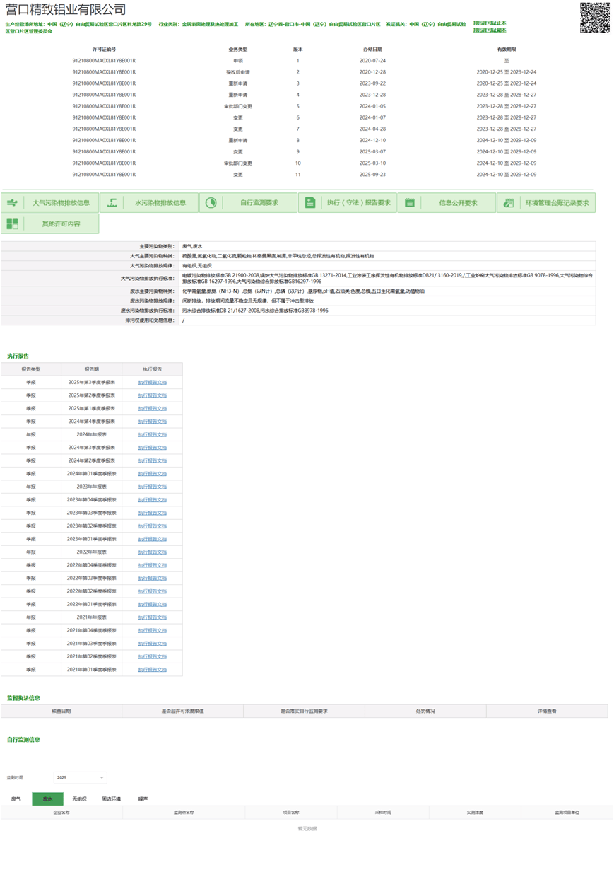 然而,在查询公开平台时发现,在营口精致铝业有限公司的“自行监测信息”栏目中,废气、废水等关键监测数据仍显示为“暂无数据”,未按规定上传和更新,信息公开内容缺失。