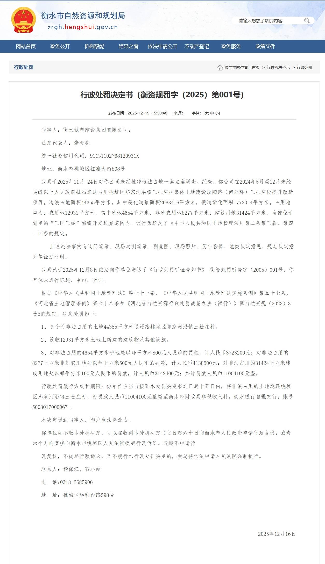 据衡水市人民政府官网消息,衡水市自然资源和规划局于2025年12月19日发布行政处罚决定书(文号:衡资规罚字(2025)第001号),对衡水城市建设集团有限公司违法占地行为作出行政处罚。