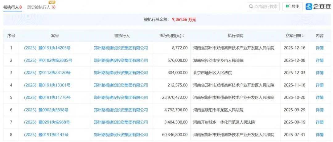 值得注意的是,郑州路桥集团还深陷法律纠纷,2025年以来频繁成为被执行人。企查查显示,截至今年12月19日,郑州路桥集团近一年有8条被执行人记录,被执行总金额高达9361.56万元。其中,金额最高的一笔执行案是在2025年7月31日,河南省郑州市郑州高新技术产业开发区人民法院将郑州路桥集团纳入被执行人名单,执行标的6034.68万元。