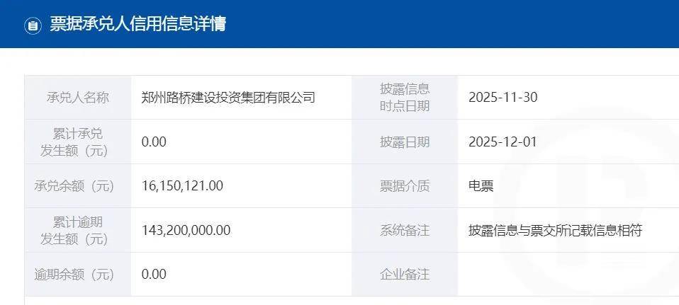 2025年12月,郑州路桥建设投资集团有限公司(以下简称“郑州路桥集团”)被列入上海票据交易所披露的持续逾期名单。截至2025年11月30日,公司逾期余额为0.00亿元,累计逾期发生额为1.43亿元。