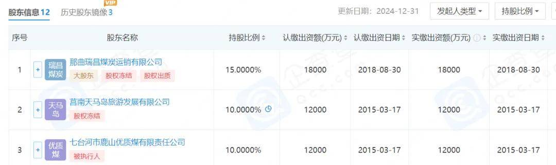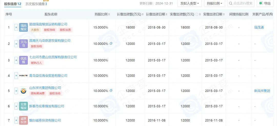 企查查提供的信息显示,瑞昌煤炭是深圳前海瑞茂通供应链平台服务有限公司的全资子公司,后者又是江苏晋和电力燃料有限公司的全资子公司,而江苏晋和电力燃料有限公司又是瑞茂通的全资子公司。截至目前,瑞昌煤炭位居华海保险第一大股东席位,持股比例15%,认缴出资额和实缴出资额均为1.8亿元。该笔股权目前已被郑州市中级人民法院司法冻结,冻结日期自2025年12月3日至2028年12月2日。
