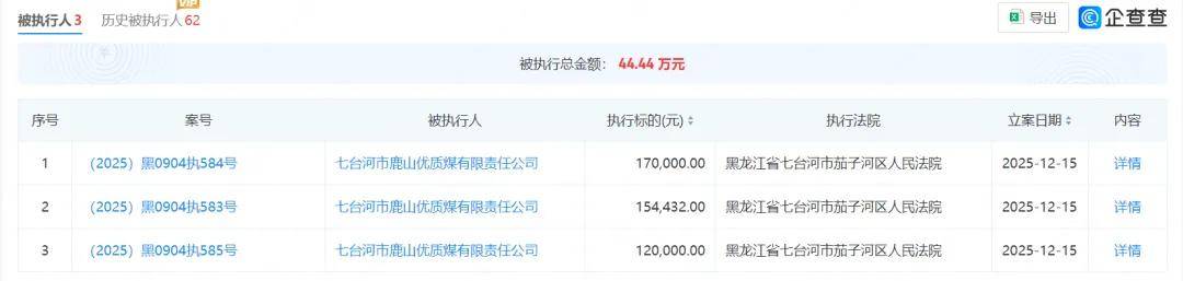 除上述三家股东持股状态“异常”外,华海保险还有一家股东被法院列入被执行人。企查查提供的信息显示,华海保险并列第二大股东七台河市鹿山优质煤有限责任公司(简称“鹿山优质煤”)本月三次被立案执行,被执行总金额44.44 万元。该公司历史被执行人信息多达62条,被执行总金额722.56 万元。