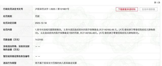 2025年12月18日,行政处罚决定书显示,一心堂药业集团股份有限公司泸西阿庐大街连锁店(以下简称:一心堂泸西阿庐大街连锁店)在慢性病药品销售过程中存在“将不属于医保支付范围的纳入医保基金结算”违规问题 。