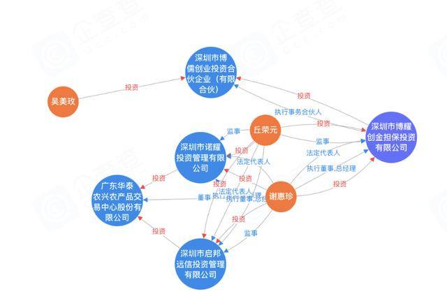 企查查信息显示,博耀创金公司股东为谢惠珍、丘荣元两人,其中谢惠珍持股95%,丘荣元持股5%。两人共同控制深圳市诺耀投资管理有限公司、深圳市启邦远信投资管理有限公司,而这两家公司与金雅福共同持股广东华泰农兴农产品交易中心。