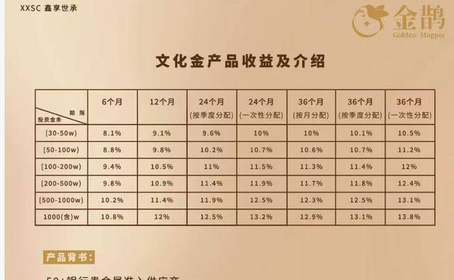 最终吸引投资者的仍是高收益率。以上述“鑫享世承”文化金产品为例,其收益率根据投资金额与期限浮动。最低一档为投资30万至50万元、期限6个月,年化收益率为8.1%;若投资金额在1000万元以上、期限3年,年化收益率可达13.8%。