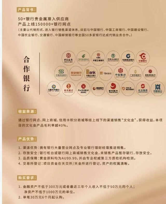 所谓文化金渠道是什么?为什么能提供高额收益?根据投资者提供的一则文化金“鑫享世承”产品宣传单,该产品自称目前是50家银行贵金属准入供货商,产品上线15万个银行网点。通过上述银行网点、网上商城、信用卡积分商城等渠道销售“文化金”,可以获得超40%的毛利率。
