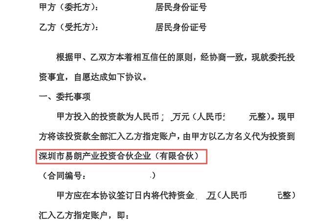 一名投资者提供的代持协议显示,投资人将资金汇入代持人指定账户,由代持人以其名义投资于深圳市易朗产业投资合伙企业(有限合伙)。