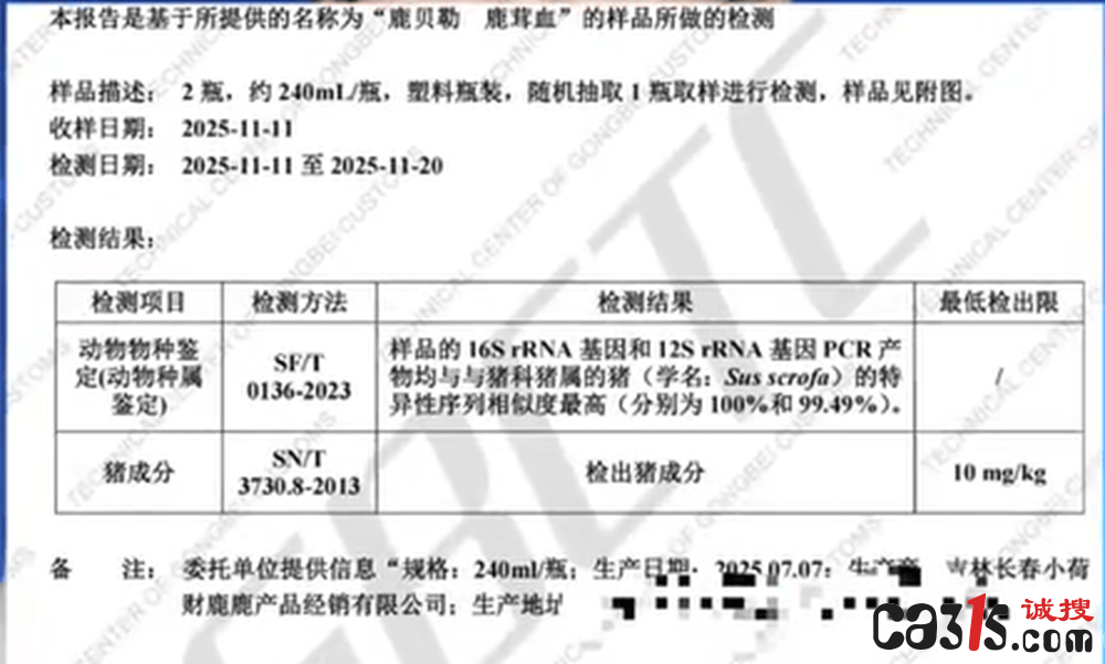 据博主“大斌”介绍,他于今年10月20日在拥有超过460万粉丝的主播“九天”的直播间下单,从名为“冠齐安九天专卖店”的店铺购买了“鹿贝勒鹿茸血”。产品单价为99.9元一盒,内含4瓶,每瓶240毫升。购买后,“大斌”将其中一瓶送检。根据其提供的由“拱北海关技术中心”出具的检测报告,对该样品的动物物种鉴定结果显示,其基因序列与猪的相似度最高,结论为“检出猪成分”。
