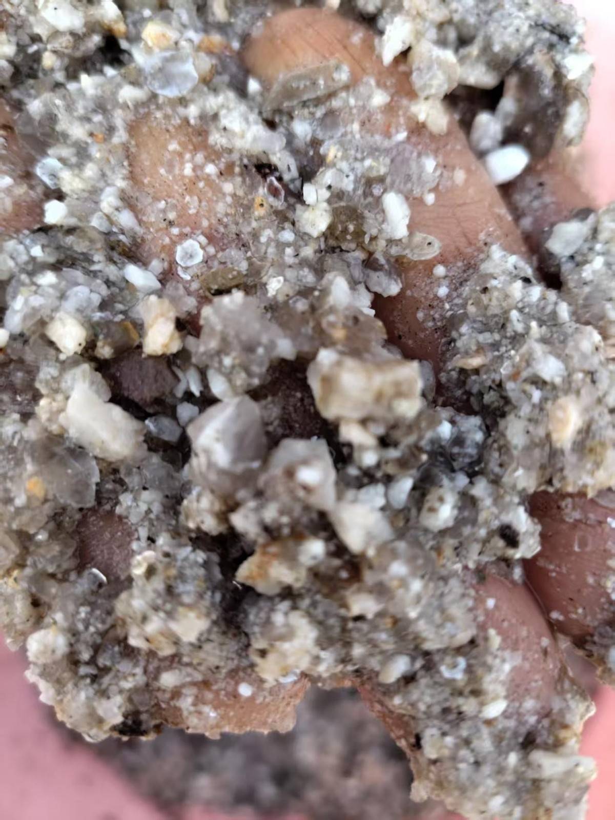 现场观察到,混凝土并非来自国家强制规定的商砼站,而是朱某某叫人用挖掘机搅拌取自河道的鹅卵石、河砂及水泥,其中大的鹅卵石块超30斤以上。经过简单“漂洗”混凝土,其中含有大量灰白色颗粒和发光片状物。村民介绍,这些发光物是云母片,如经过洗砂厂洗过,则不会出现这种软质发光云母片,所以上述混凝土用砂是直接取自河道的“毛砂”。经目测,这些片状云母的含量可能超过20%。而根据建筑工程的一般技术要求,砂子中的杂质含量通常不得超过5%,否则将影响混凝土的强度和耐久性,大幅削弱其抗压与抗拉性能。