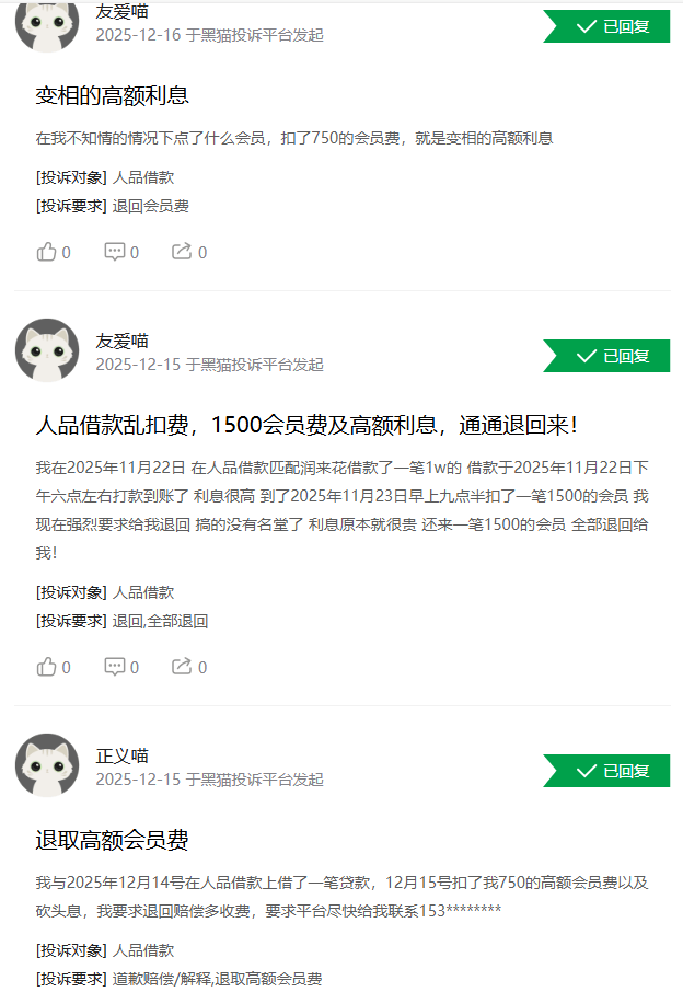 如在黑猫投诉平台,用户反应在2025年11月22日在人品借款匹配润来花借款了一笔1万元的借款并于2025年11月22日下午六点左右打款到账,利息很高,到了2025年11月23日早上九点半扣了一笔1500的会员。