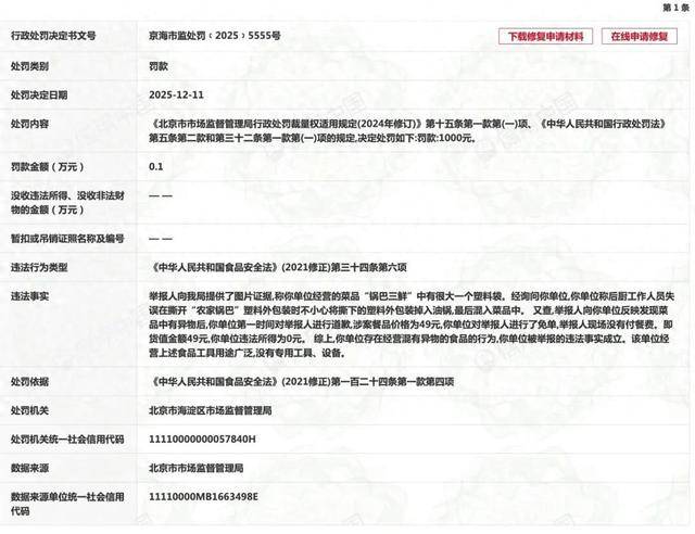 行政处罚决定书披露的细节显示,举报人向北京市海淀区市场监督管理局提供了图片证据,称该分店经营的菜品“锅巴三鲜”中有很大一个塑料袋。经询问,该分店称后厨工作人员失误在撕开“农家锅巴”塑料外包装时不小心将撕下的塑料外包装掉入油锅,最后混入菜品中。