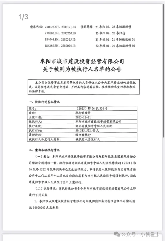 12月19日,枣阳市城市建设投资经营有限公司(以下简称“枣阳城投”)公告称,公司被列为被执行人。