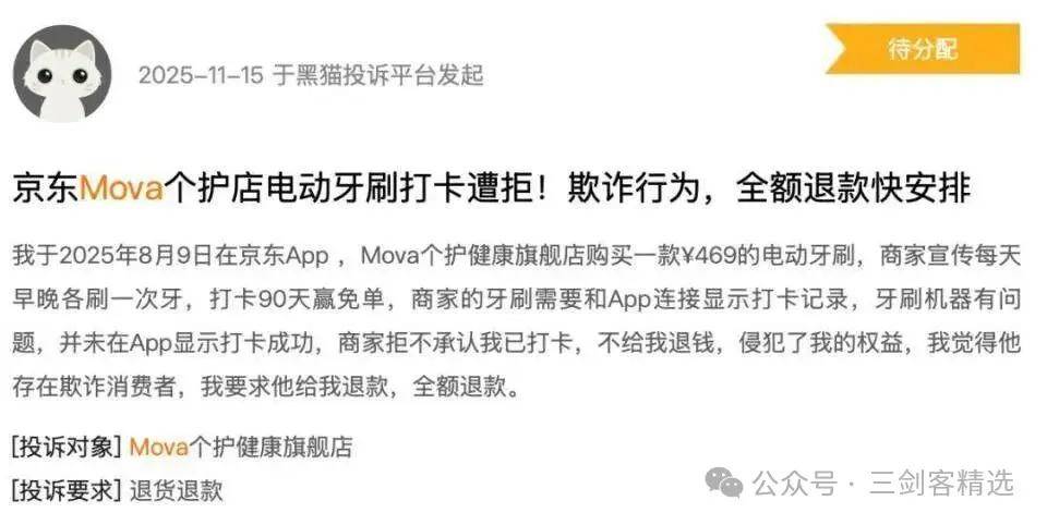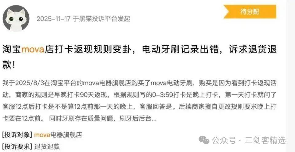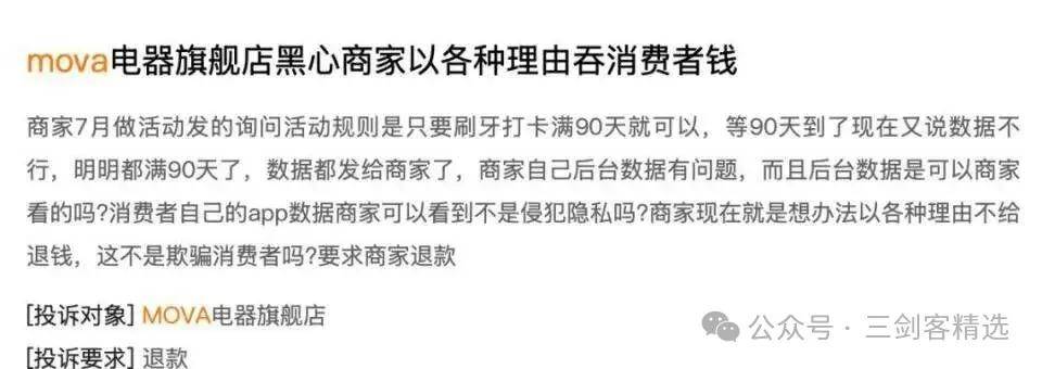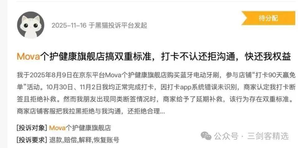 更甚者,有消费者因快递签收时间超过24小时未能及时登记打卡,被直接判定为“任务失败”;还有消费者因牙刷App自身故障未能成功记录打卡,商家却拒不承认,坚称是用户未完成操作。MOVA的“打卡返现”,不过是一场以消费者时间和信任为代价的营销骗局。