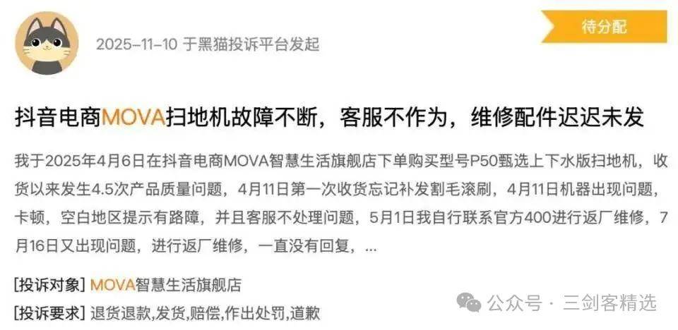 据凤凰网财经《公司研究院》报道,一位用户投诉称,2025年3月在抖音官方商城购买MOVA洗地机多次出现质量问题,寄回维修三次以上仍未能解决根本问题。更令人匪夷所思的是,所谓的“维修”仅仅是更换一个刮条,维修师傅甚至无法对机器进行全面检测。用户预测,问题后续还会继续出现,因此强烈要求退货退款。